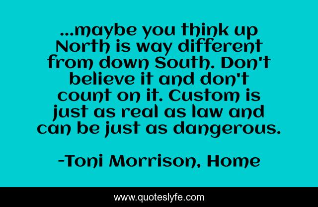 This page presents the quote "...maybe you think up North is way different from down South. Don't believe it and don't count on it. Custom is just as real as law and can be just as dangerous.". Author of this quote is Toni Morrison, Home. This quote is about home, toni-morrison,.