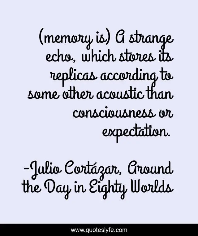 This page presents the quote "(memory is) A strange echo, which stores its replicas according to some other acoustic than consciousness or expectation.". Author of this quote is Julio Cortázar, Around the Day in Eighty Worlds. .