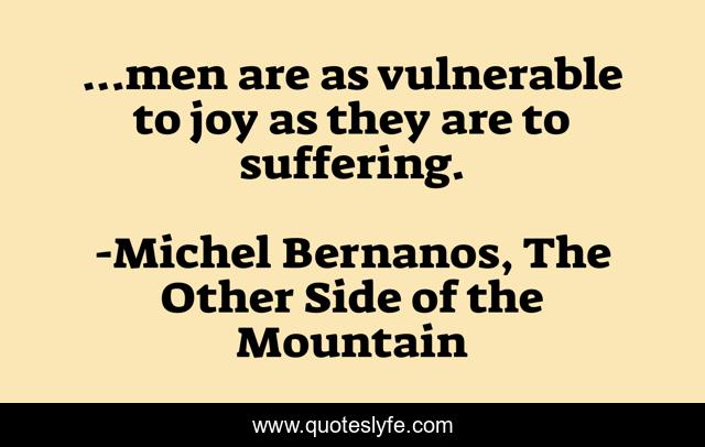 This page presents the quote "...men are as vulnerable to joy as they are to suffering.". Author of this quote is Michel Bernanos, The Other Side of the Mountain. This quote is about joy, suffering,.