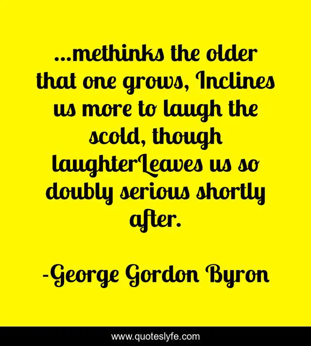This page presents the quote "...methinks the older that one grows, Inclines us more to laugh the scold, though laughterLeaves us so doubly serious shortly after.". Author of this quote is George Gordon Byron. This quote is about byron, humour, poetry,.
