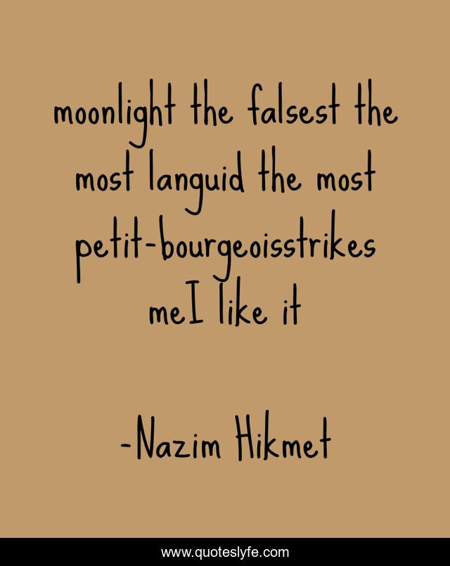 This page presents the quote "moonlight the falsest the most languid the most petit-bourgeoisstrikes meI like it". Author of this quote is Nazim Hikmet. This quote is about inspiration, poetry, moon,.