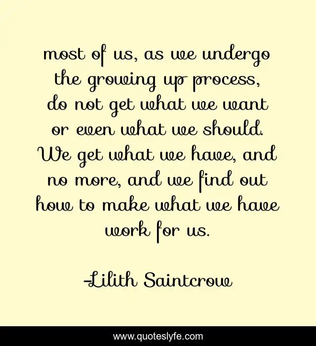 This page presents the quote "most of us, as we undergo the growing up process, do not get what we want or even what we should. We get what we have, and no more, and we find out how to make what we have work for us.". Author of this quote is Lilith Saintcrow. .
