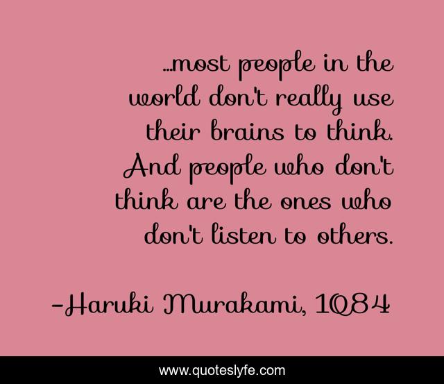 This page presents the quote "...most people in the world don't really use their brains to think. And people who don't think are the ones who don't listen to others.". Author of this quote is Haruki Murakami, 1Q84. This quote is about thinking, listening,.