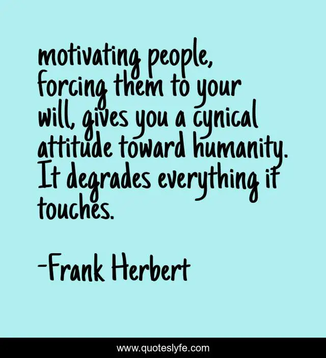 This page presents the quote "motivating people, forcing them to your will, gives you a cynical attitude toward humanity. It degrades everything it touches.". Author of this quote is Frank Herbert. This quote is about motivation, cynicism,.