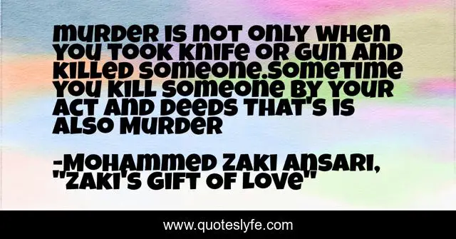 This page presents the quote "murder is not only when you took knife or gun and killed someone.Sometime you kill someone by your Act and deeds That's is also Murder". Author of this quote is Mohammed Zaki Ansari, "Zaki's Gift Of Love". This quote is about world, life,.