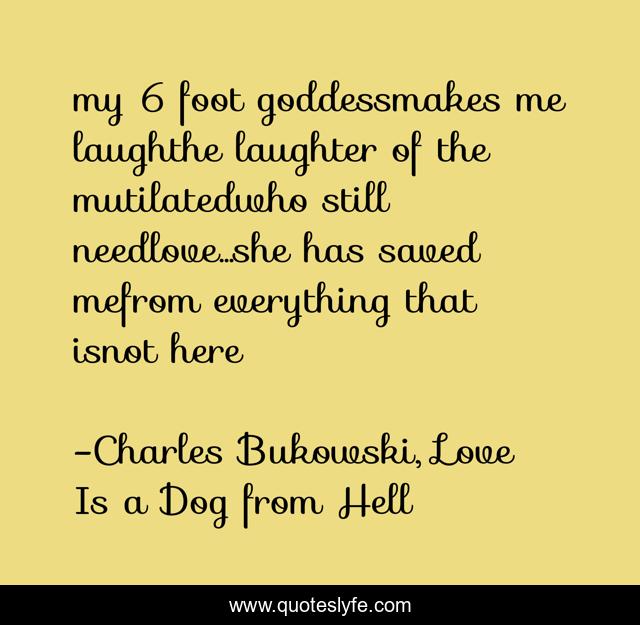 This page presents the quote "my 6 foot goddessmakes me laughthe laughter of the mutilatedwho still needlove...she has saved mefrom everything that isnot here". Author of this quote is Charles Bukowski, Love Is a Dog from Hell. .
