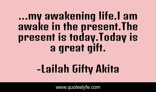This page presents the quote "...my awakening life.I am awake in the present.The present is today.Today is a great gift.". Author of this quote is Lailah Gifty Akita. This quote is about today-is-your-day, awake-my-soul, awakened-mind, gifted, gift, today-is-a-good-day-to-be-woman, awakenings, great-work, great-expectations,.