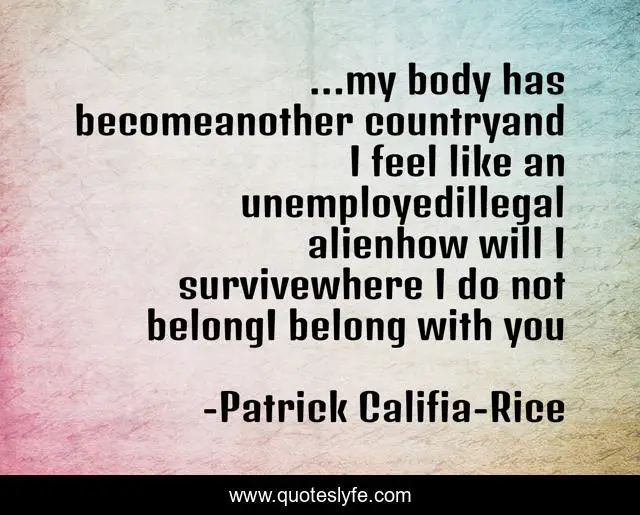 This page presents the quote "...my body has becomeanother countryand I feel like an unemployedillegal alienhow will I survivewhere I do not belongI belong with you". Author of this quote is Patrick Califia-Rice. This quote is about canada, longing, change, poem,.