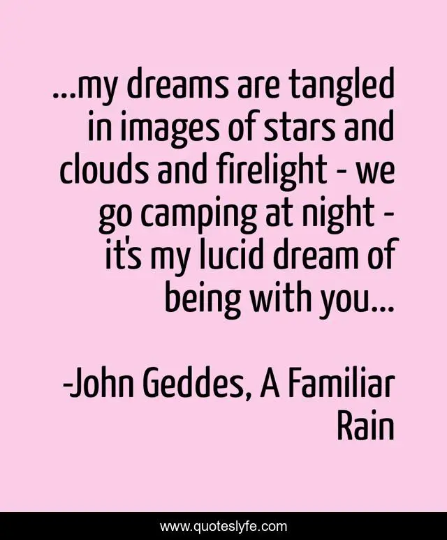 This page presents the quote "...my dreams are tangled in images of stars and clouds and firelight - we go camping at night - it's my lucid dream of being with you...". Author of this quote is John Geddes, A Familiar Rain. This quote is about firelight, love, camping, poetry, dreams, stars, night, clouds, affection,.