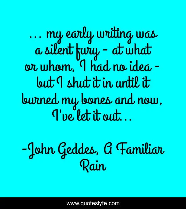 "John Geddes, A Familiar Rain Quotes." Quoteslyfe.com, 2025. Fri. 05 Dec. 2025. <https://www.quoteslyfe.com/quote/my-early-writing-was-a-silent-fury-219329>.