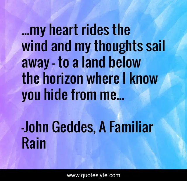 This page presents the quote "...my heart rides the wind and my thoughts sail away - to a land below the horizon where I know you hide from me...". Author of this quote is John Geddes, A Familiar Rain. This quote is about heart, land, sail-away, thoughts, horizon, poetry-love, wind,.