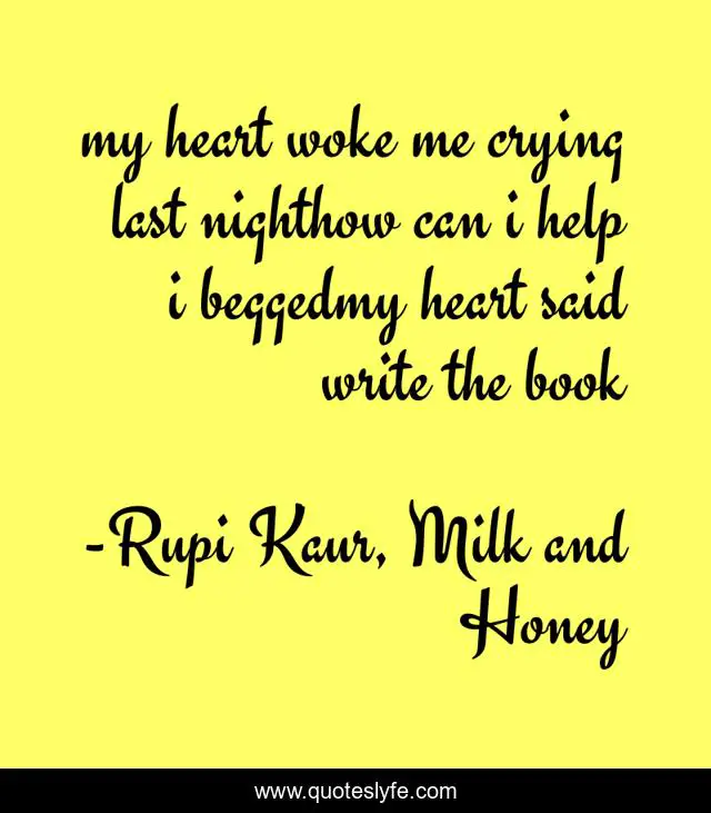 This page presents the quote "my heart woke me crying last nighthow can i help i beggedmy heart said write the book". Author of this quote is Rupi Kaur, Milk and Honey. This quote is about heart, help, beg, write, book, crying,.