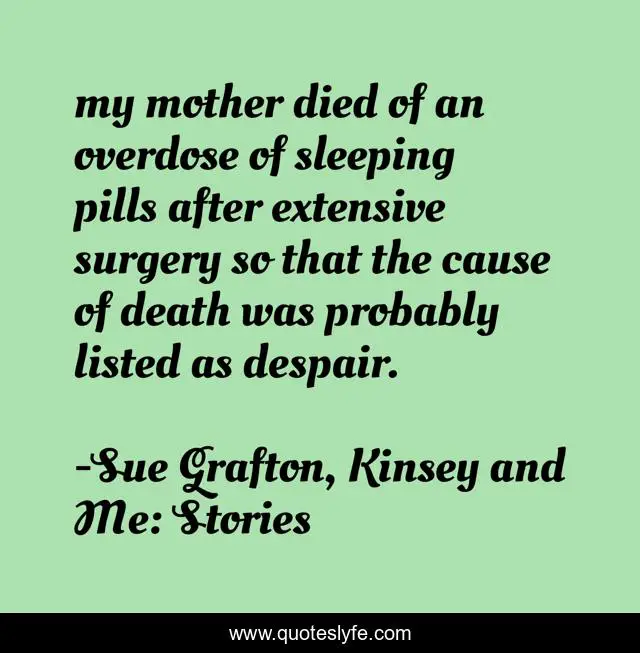 This page presents the quote "my mother died of an overdose of sleeping pills after extensive surgery so that the cause of death was probably listed as despair.". Author of this quote is Sue Grafton, Kinsey and Me: Stories. .