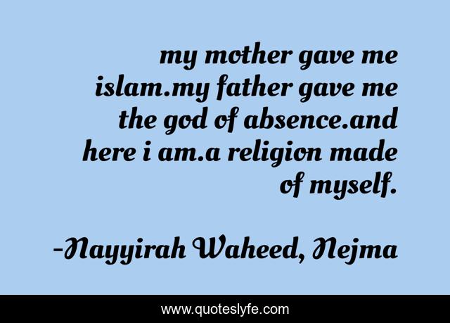 This page presents the quote "my mother gave me islam.my father gave me the god of absence.and here i am.a religion made of myself.". Author of this quote is Nayyirah Waheed, Nejma. This quote is about religion, poetry, islam,.