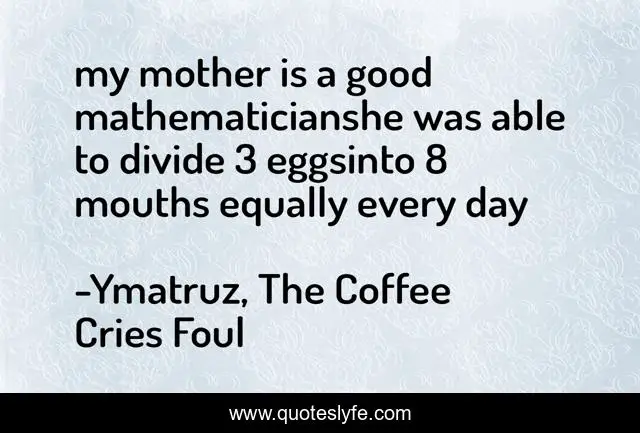 This page presents the quote "my mother is a good mathematicianshe was able to divide 3 eggsinto 8 mouths equally every day". Author of this quote is Ymatruz, The Coffee Cries Foul. This quote is about love, motherhood, inspirational, mother, enthusiasm, affection,.