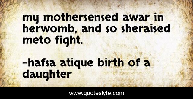 This page presents the quote "my mothersensed awar in herwomb, and so sheraised meto fight.". Author of this quote is hafsa atique birth of a daughter. This quote is about women-warriors, womens-strength, women,.