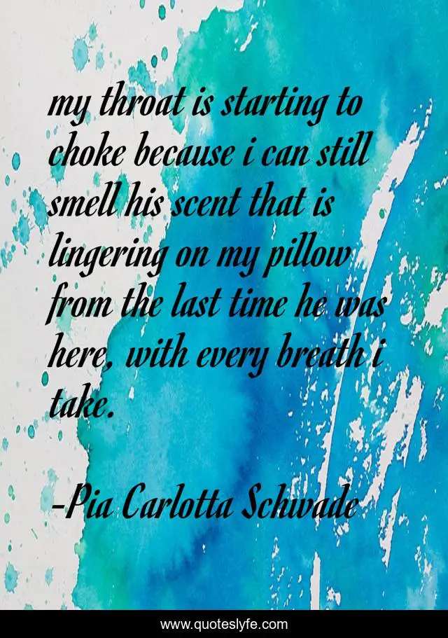 This page presents the quote "my throat is starting to choke because i can still smell his scent that is lingering on my pillow from the last time he was here, with every breath i take.". Author of this quote is Pia Carlotta Schwade. This quote is about romance, love, affection, romance-novels,.