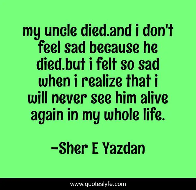 This page presents the quote "my uncle died.and i don't feel sad because he died.but i felt so sad when i realize that i will never see him alive again in my whole life.". Author of this quote is Sher E Yazdan. This quote is about sorrow, sadness, life, feelings,.