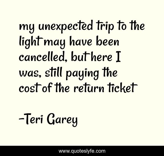 This page presents the quote "my unexpected trip to the light may have been cancelled, but here I was, still paying the cost of the return ticket". Author of this quote is Teri Garey. .