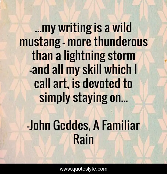 This page presents the quote "...my writing is a wild mustang - more thunderous than a lightning storm -and all my skill which I call art, is devoted to simply staying on...". Author of this quote is John Geddes, A Familiar Rain. This quote is about skill, art, writing-advice,.