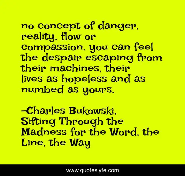 This page presents the quote "no concept of danger, reality, flow or compassion. you can feel the despair escaping from their machines, their lives as hopeless and as numbed as yours.". Author of this quote is Charles Bukowski, Sifting Through the Madness for the Word, the Line, the Way. This quote is about charles-bukowski, commerce, despair, hopeless, numb,.