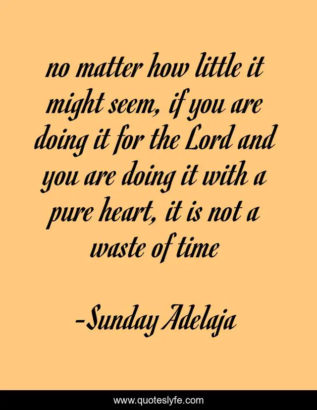 This page presents the quote "no matter how little it might seem, if you are doing it for the Lord and you are doing it with a pure heart, it is not a waste of time". Author of this quote is Sunday Adelaja. This quote is about service, pure-heart, calling, purpose, lord, reward,.