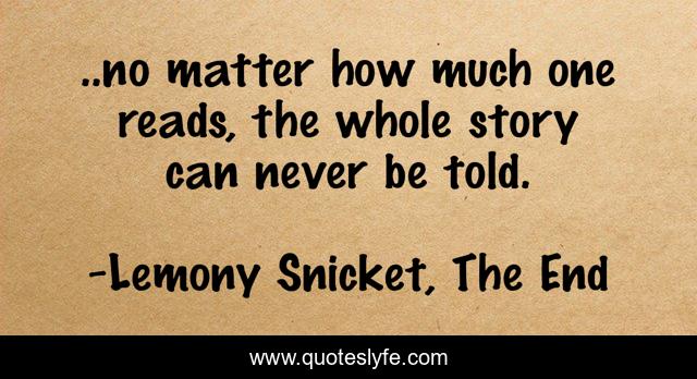 This page presents the quote "..no matter how much one reads, the whole story can never be told.". Author of this quote is Lemony Snicket, The End. This quote is about lessons, life, books, reading,.