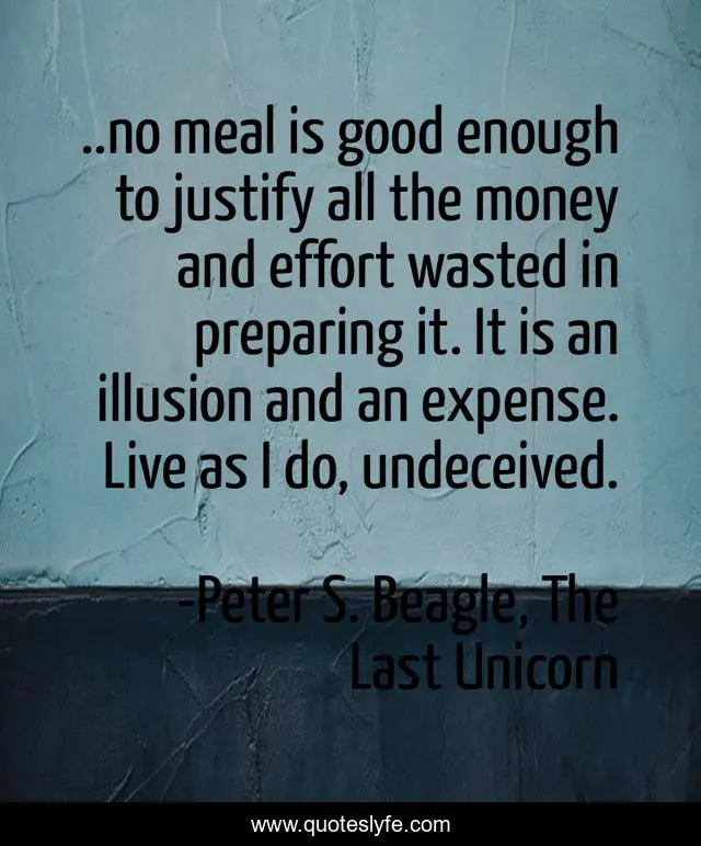 This page presents the quote "..no meal is good enough to justify all the money and effort wasted in preparing it. It is an illusion and an expense. Live as I do, undeceived.". Author of this quote is Peter S. Beagle, The Last Unicorn. This quote is about waste, meal, illusion, expense,.