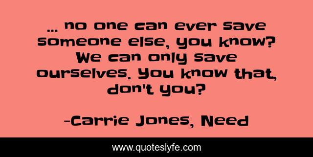 This page presents the quote "... no one can ever save someone else, you know? We can only save ourselves. You know that, don't you?". Author of this quote is Carrie Jones, Need. This quote is about personal-responsibility, self-determination,.