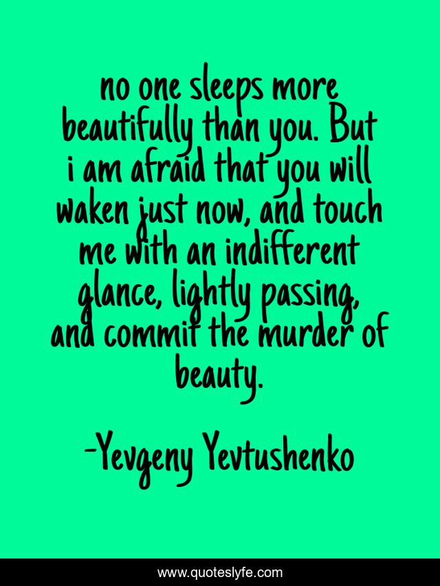 This page presents the quote "no one sleeps more beautifully than you. But i am afraid that you will waken just now, and touch me with an indifferent glance, lightly passing, and commit the murder of beauty.". Author of this quote is Yevgeny Yevtushenko. .