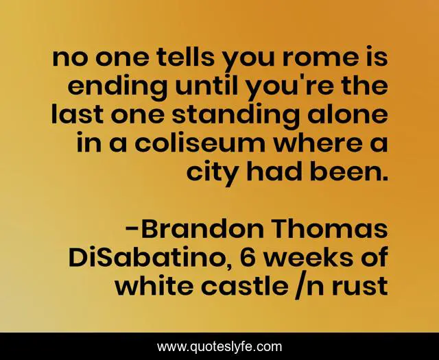This page presents the quote "no one tells you rome is ending until you're the last one standing alone in a coliseum where a city had been.". Author of this quote is Brandon Thomas DiSabatino, 6 weeks of white castle /n rust. This quote is about ancient-rome, poetry, changing-times,.