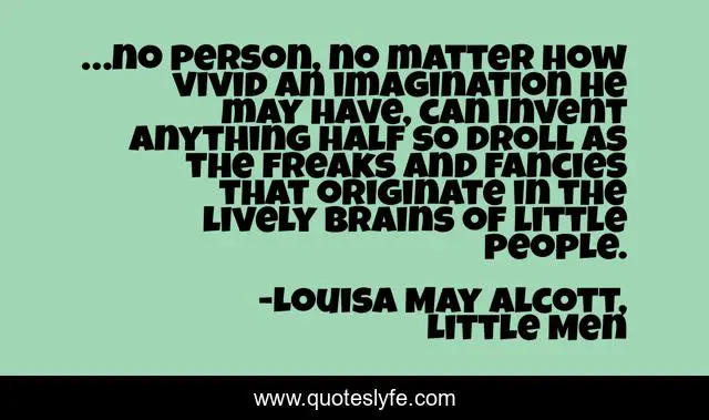 This page presents the quote "…no person, no matter how vivid an imagination he may have, can invent anything half so droll as the freaks and fancies that originate in the lively brains of little people.". Author of this quote is Louisa May Alcott, Little Men. This quote is about little-men, louisa-may-alcott, children,.