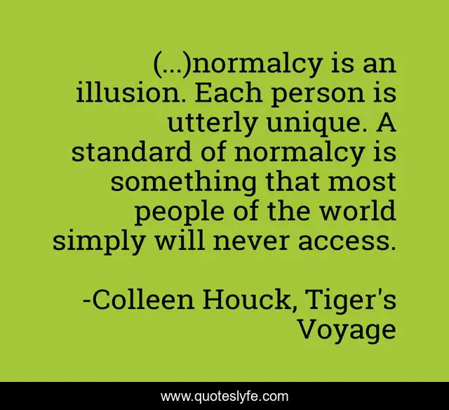 This page presents the quote "(...)normalcy is an illusion. Each person is utterly unique. A standard of normalcy is something that most people of the world simply will never access.". Author of this quote is Colleen Houck, Tiger's Voyage. This quote is about kelsey, ren, life-lessons,.