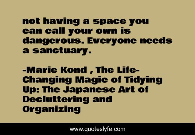 This page presents the quote "not having a space you can call your own is dangerous. Everyone needs a sanctuary.". Author of this quote is Marie Kondō, The Life-Changing Magic of Tidying Up: The Japanese Art of Decluttering and Organizing. This quote is about enthusiasm, self-awareness, inspirational,.