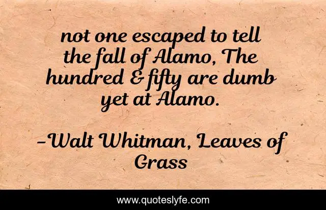 This page presents the quote "not one escaped to tell the fall of Alamo, The hundred & fifty are dumb yet at Alamo.". Author of this quote is Walt Whitman, Leaves of Grass. .