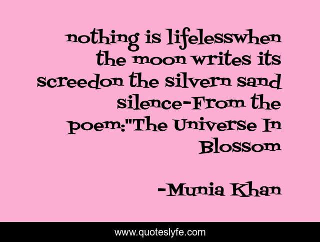 This page presents the quote "nothing is lifelesswhen the moon writes its screedon the silvern sand silence-From the poem:"The Universe In Blossom". Author of this quote is Munia Khan. This quote is about screed, life, poetry, moon, poetry-life, sand, silence,.