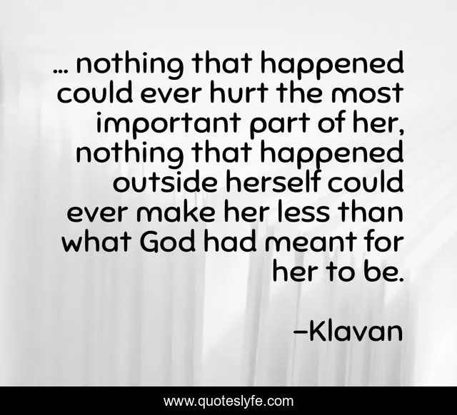 This page presents the quote "... nothing that happened could ever hurt the most important part of her, nothing that happened outside herself could ever make her less than what God had meant for her to be.". Author of this quote is Klavan. This quote is about god, self,.