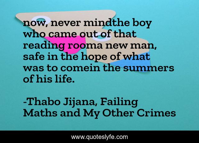 This page presents the quote "now, never mindthe boy who came out of that reading rooma new man, safe in the hope of what was to comein the summers of his life.". Author of this quote is Thabo Jijana, Failing Maths and My Other Crimes. This quote is about summer, library, youth, boys, reading, hope,.