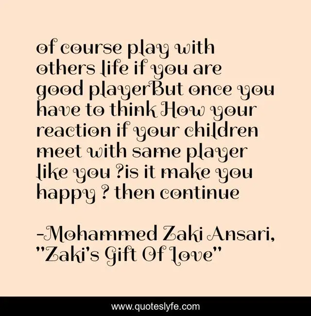 This page presents the quote "of course play with others life if you are good playerBut once you have to think How your reaction if your children meet with same player like you ?is it make you happy ? then continue". Author of this quote is Mohammed Zaki Ansari, "Zaki's Gift Of Love". This quote is about life-love-truth, world,.