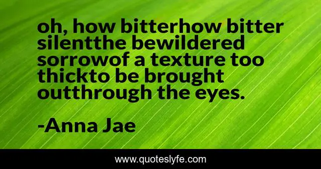 This page presents the quote "oh, how bitterhow bitter silentthe bewildered sorrowof a texture too thickto be brought outthrough the eyes.". Author of this quote is Anna Jae. This quote is about bewilderment, sorrow,.