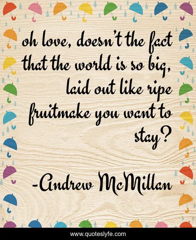 This page presents the quote "oh love, doesn’t the fact that the world is so big, laid out like ripe fruitmake you want to stay?". Author of this quote is Andrew McMillan. This quote is about love, ripe, big, stay, fruit, world, affection,.