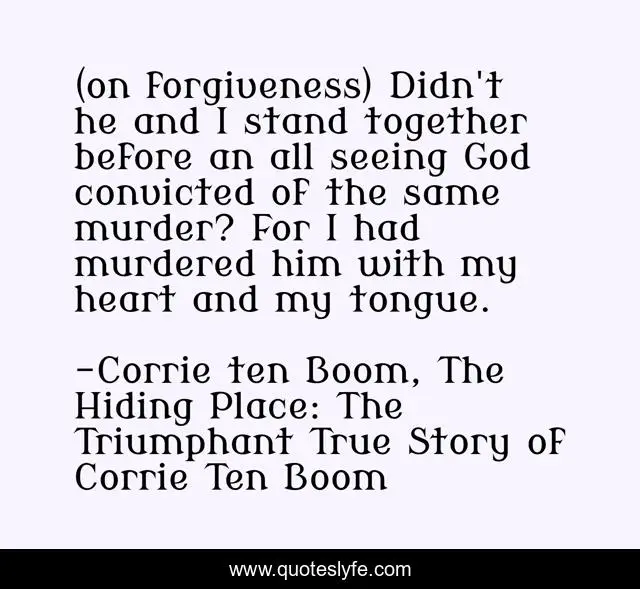 This page presents the quote "(on forgiveness) Didn't he and I stand together before an all seeing God convicted of the same murder? For I had murdered him with my heart and my tongue.". Author of this quote is Corrie ten Boom, The Hiding Place: The Triumphant True Story of Corrie Ten Boom. This quote is about god, forgiveness,.