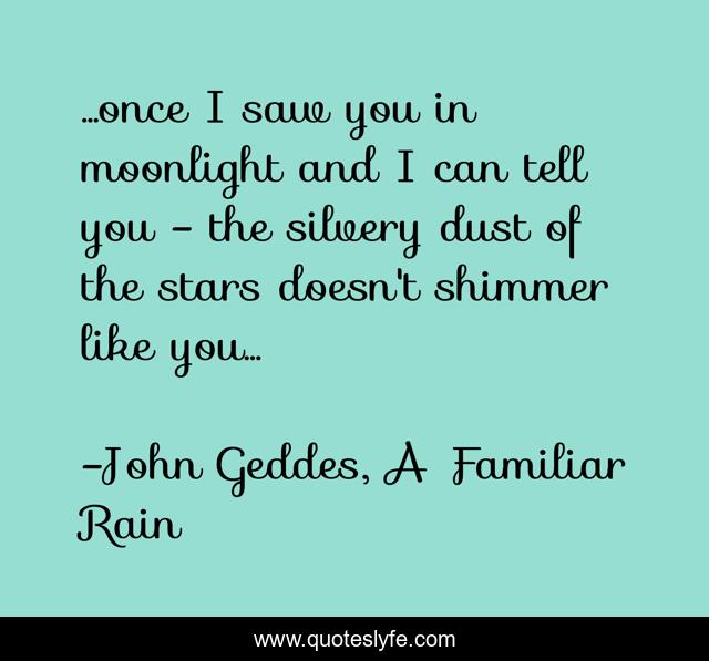 This page presents the quote "...once I saw you in moonlight and I can tell you - the silvery dust of the stars doesn't shimmer like you...". Author of this quote is John Geddes, A Familiar Rain. This quote is about love, shimmer, silvery, moonlight, stars, affection,.