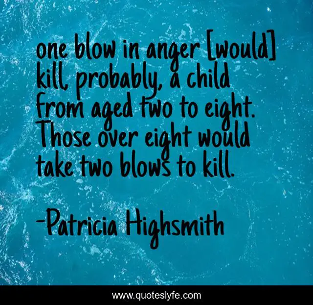 This page presents the quote "one blow in anger [would] kill, probably, a child from aged two to eight. Those over eight would take two blows to kill.". Author of this quote is Patricia Highsmith. This quote is about murder, humour, crime, inspirational, enthusiasm, children,.