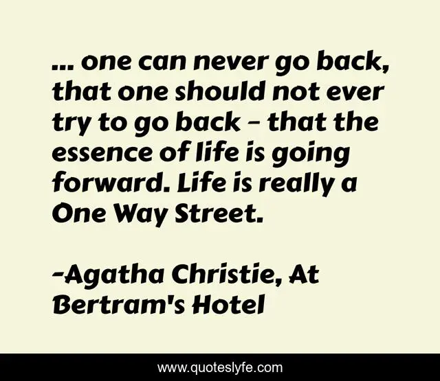 This page presents the quote "… one can never go back, that one should not ever try to go back – that the essence of life is going forward. Life is really a One Way Street.". Author of this quote is Agatha Christie, At Bertram's Hotel. This quote is about life-philosophy, life-and-living, inspirational, enthusiasm,.