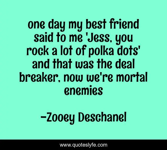 This page presents the quote "one day my best friend said to me 'Jess, you rock a lot of polka dots' and that was the deal breaker, now we're mortal enemies". Author of this quote is Zooey Deschanel. This quote is about polka-dots, friend-ship, new-girl, enemies,.