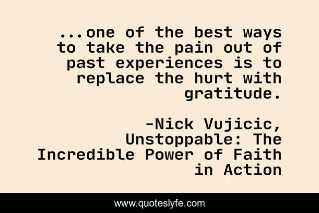 This page presents the quote "...one of the best ways to take the pain out of past experiences is to replace the hurt with gratitude.". Author of this quote is Nick Vujicic, Unstoppable: The Incredible Power of Faith in Action. This quote is about gratitude, past, pain, hurt,.