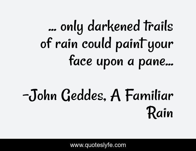 This page presents the quote "... only darkened trails of rain could paint your face upon a pane...". Author of this quote is John Geddes, A Familiar Rain. This quote is about face, poetry, rain, darkness,.