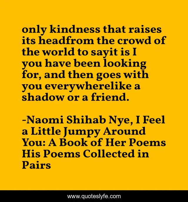 This page presents the quote "only kindness that raises its headfrom the crowd of the world to sayit is I you have been looking for, and then goes with you everywherelike a shadow or a friend.". Author of this quote is Naomi Shihab Nye, I Feel a Little Jumpy Around You: A Book of Her Poems His Poems Collected in Pairs. .