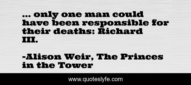 This page presents the quote "... only one man could have been responsible for their deaths: Richard III.". Author of this quote is Alison Weir, The Princes in the Tower. This quote is about murder, royalty, war-of-the-roses, conclusion,.